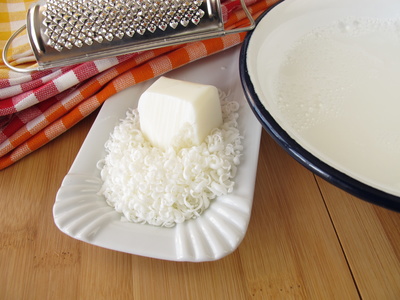 - Reszelje a túrószappant apró darabokra egy reszelő segítségével (apró pelyheket reszeljen, a túl nagy darabok nem fognak feloldódni).