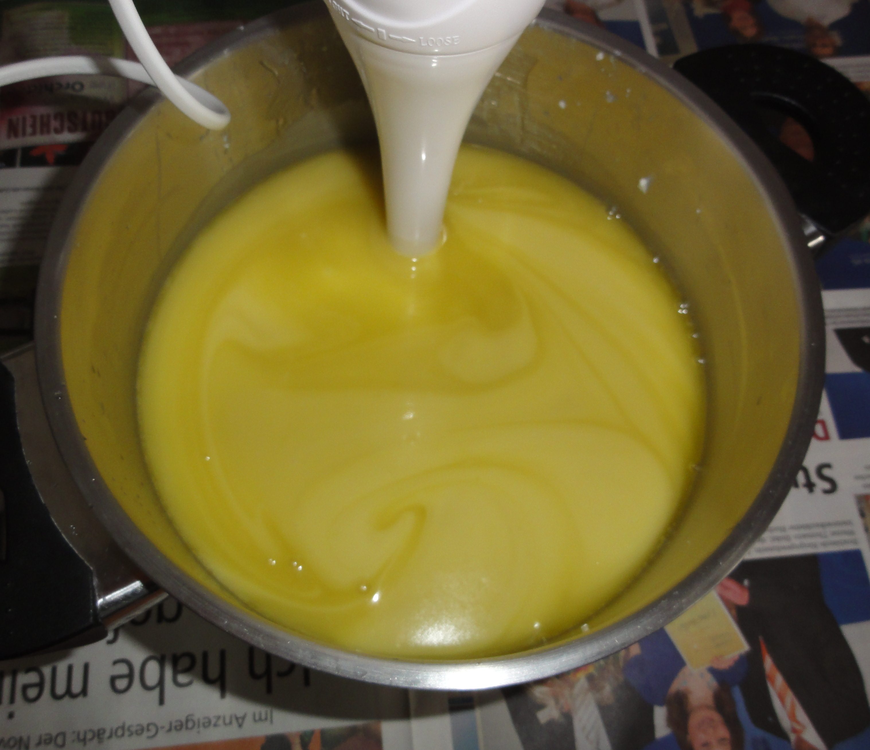 Ha biztos benne, hogy helyesen számolta ki a NaOH mennyiségét (ha kétségei vannak, számolja újra), egyszerűen csak keverje tovább szorgalmasan a botmixerrel, amíg a szappanragasztó be nem sűrűsödik. A nagy nyíróerő itt a leghatékonyabb. Egyszerűen hagyhatja állni a kevert szappanragasztót egy ideig, majd öt perc múlva ismét keverje meg. Ha van otthon olyan illóolaj, amelyről tudja, hogy gyorsan besűríti a nyers szappant, akkor ezt is hozzáadhatja a szappanragasztóhoz.
