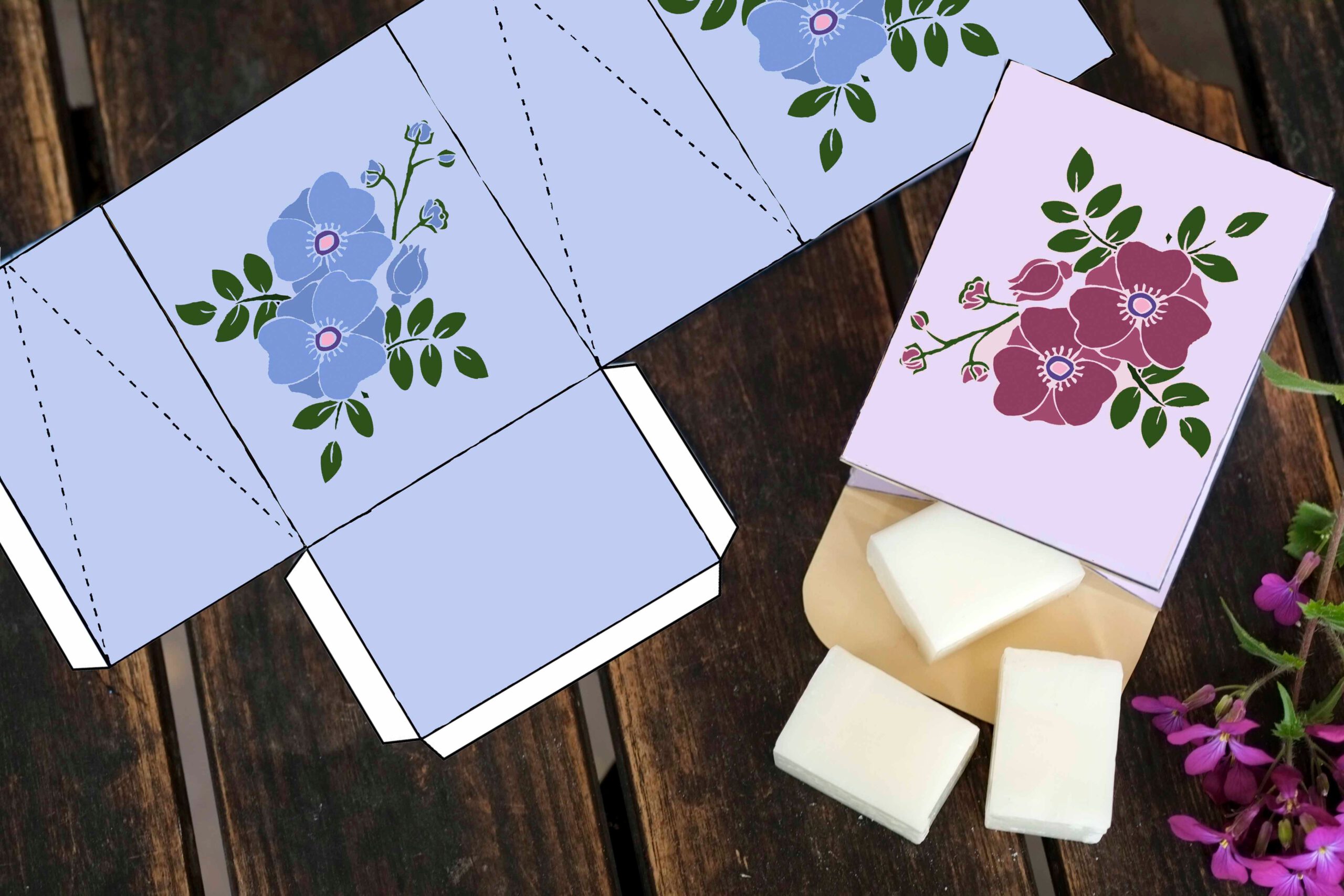 Legyen szó házi készítésű szappanokról, kis fürdőbombákról, fürdősókról vagy tusfürdőkről, ezekkel a sablonokkal könnyedén elkészítheti ezeket a gyönyörű hajtogatott dobozokat. Egyszerűen töltse le a hajtogatható dobozsablont kinyomtatásra, nyomtassa ki erős papírra vagy kartonra, vágja ki, majd hajtsa össze a vonalak mentén.
